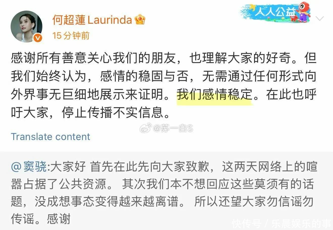紧接着,何超莲转发了老公窦骁的文章,并且发文评论说,感谢所有善意关心我们的朋友,也理解大家的好奇。但我们始终认为,感情的稳固与否,无需通过任何形式向外界事无巨细地展示来证明。我们感情稳定。在此也呼吁大家,停止传播不实信息。